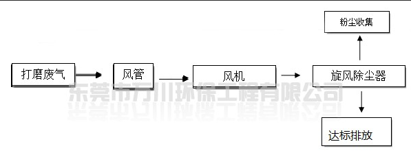 二樓的切削打磨屬于粉塵廢氣,打磨拋光時(shí)所產(chǎn)生的粉塵通過(guò)收集由引風(fēng)機(jī)抽至車間外。本方案設(shè)計(jì)設(shè)粉塵廢氣處理系統(tǒng)二套,處理能力為15000m3/h,系統(tǒng)設(shè)于車間一樓。