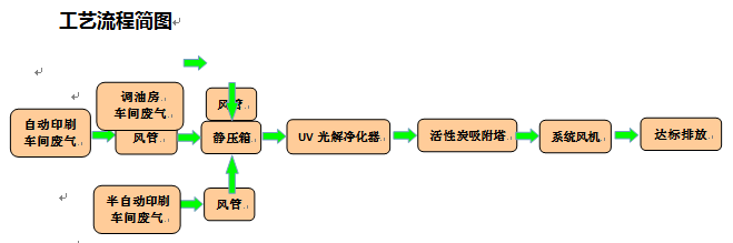 因為該企業(yè)印刷機車間均為密閉車間,且已做排風(fēng)系統(tǒng),但排風(fēng)系統(tǒng)和小風(fēng)機均為直排到高空和廠房1樓外部,影響到了周圍環(huán)境。經(jīng)過我司工程師現(xiàn)場勘查,結(jié)合企業(yè)的實際生產(chǎn)情況,我們最終決定采用UV光解法+活性炭吸附法來進(jìn)行處理。