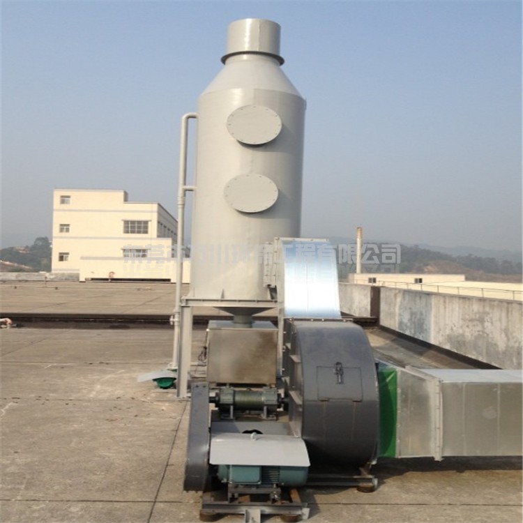 含塵廢氣在風(fēng)機(jī)的作用下,含塵氣體從塔體下方進(jìn)氣口沿切向進(jìn)入濕式除塵器噴淋塔,在風(fēng)機(jī)的作用下,迅速充滿進(jìn)氣段空間,然后塔頂位置的噴淋頭向下噴水,水與含塵廢氣接觸,使得空氣和粉塵分離,達(dá)到除塵的效果。濕式除塵器噴淋塔具有結(jié)構(gòu)簡(jiǎn)單、造價(jià)低、占地面積小、凈化效率高等優(yōu)點(diǎn),能夠處理高溫、高濕的氣流,將著火、爆炸的可能減至最低。