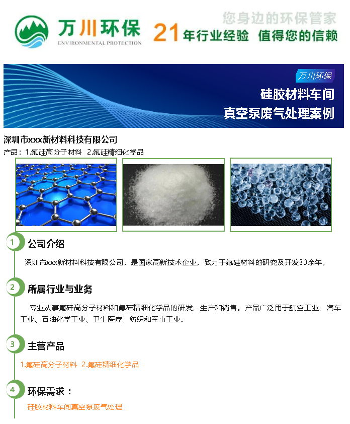 簡(jiǎn)介: 深圳市xxx新材料科技有限公司,是國(guó)家高新技術(shù)企業(yè),致力于氟硅材料的研究及開發(fā)30余年。萬川環(huán)保受邀對(duì)硅膠材料加工車間真空泵廢氣進(jìn)行處理。本文介紹了硅膠材料真空泵廢氣處理中說使用的設(shè)備與方案。